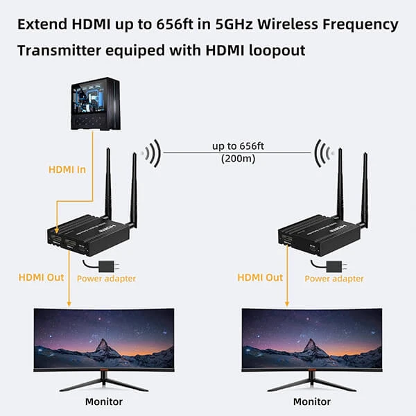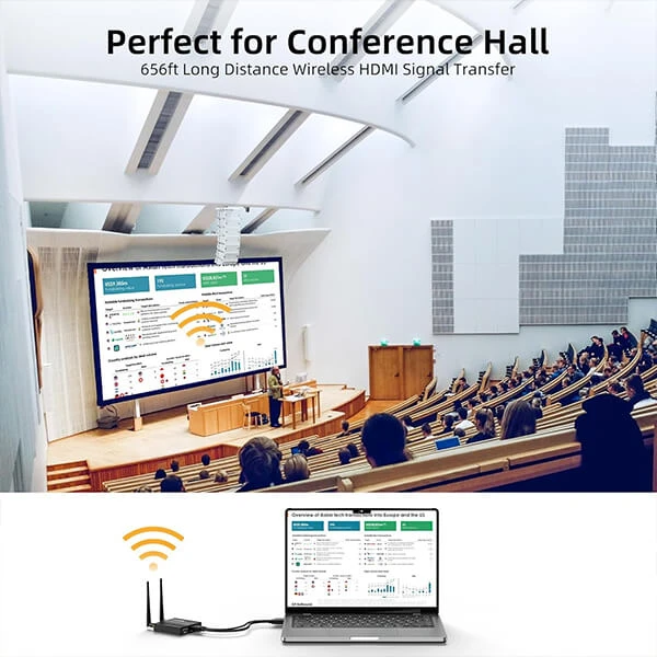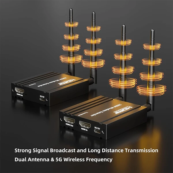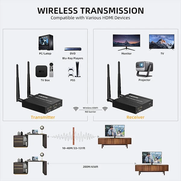 The 200M Wireless HDMI Extender Transmitter and Receiver is built for stable, long-range wireless video and audio transmission without messy HDMI cables. Designed for offices, classrooms, events, digital signage, and home entertainment.