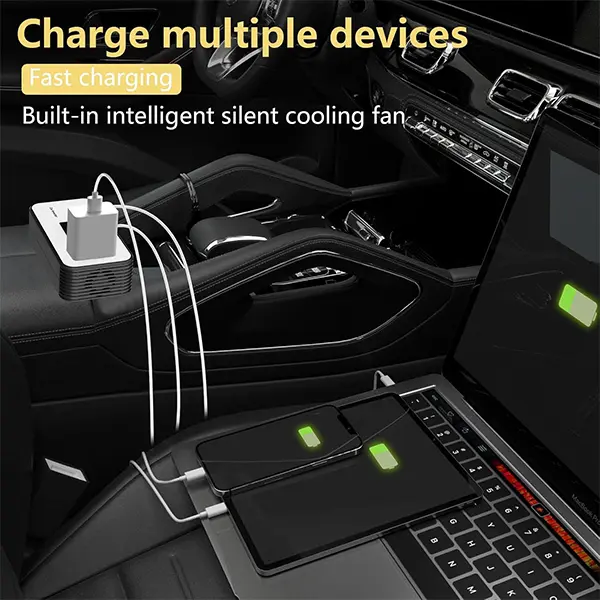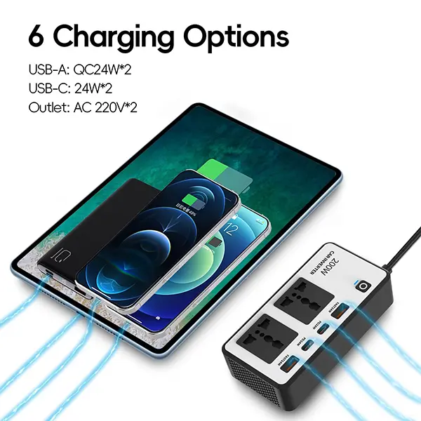 - The car power inverter converts 12v to 220v and has 2 plug outlets and 4 fast-charging USB ports.