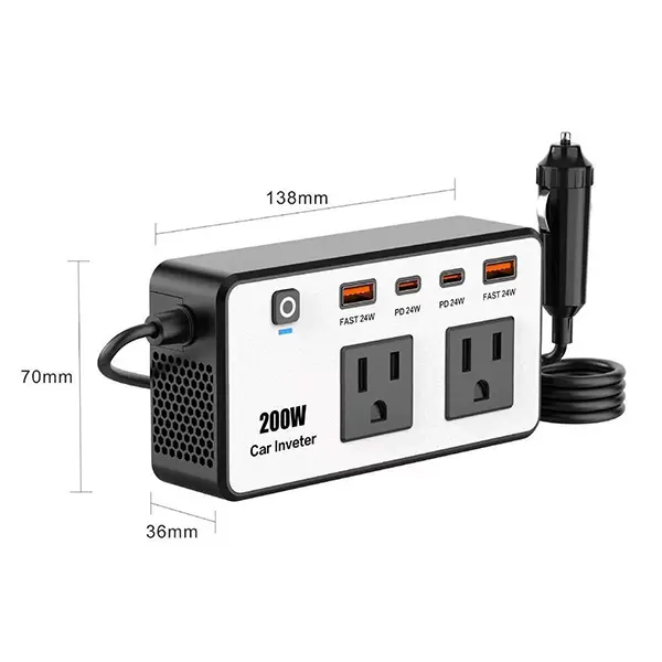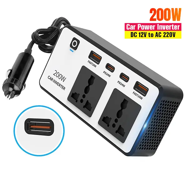 Upgrade your travel experience with the 200W Car DC Power Inverter 12V to 220V AC Inverter. It converts 12V DC to 220V AC and features Quick Charge PD 24W and QC 24W for efficient charging on the road. Perfect for powering devices on the go.