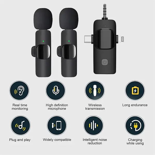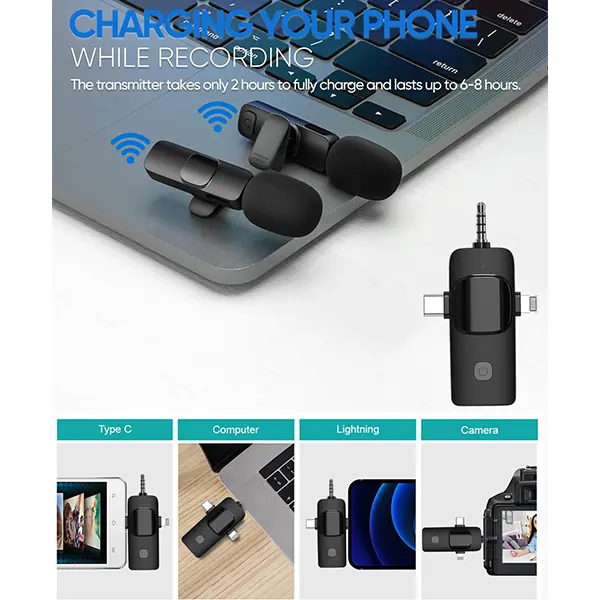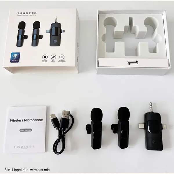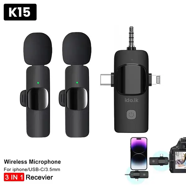 Take your audio recording to the next level with the K15 3 in 1 Dual Wireless Microphone — the ultimate plug-and-play lapel microphone system for content creators, presenters, educators, and vloggers. This high-performance mic includes three connection options — USB-C, Lightning, and 3.5mm — making it compatible with virtually all smartphones, cameras, tablets, and laptops.