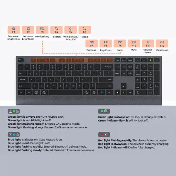 The Rechargeable MEETION C2000 Wireless Keyboard and Mouse Combo ensures lag-free wireless performance with its advanced 2.4GHz + Bluetooth connection, providing a reliable range of up to 10 meters. Its ergonomic layout, responsive keys, and energy-efficient design allow you to work comfortably and efficiently all day long.